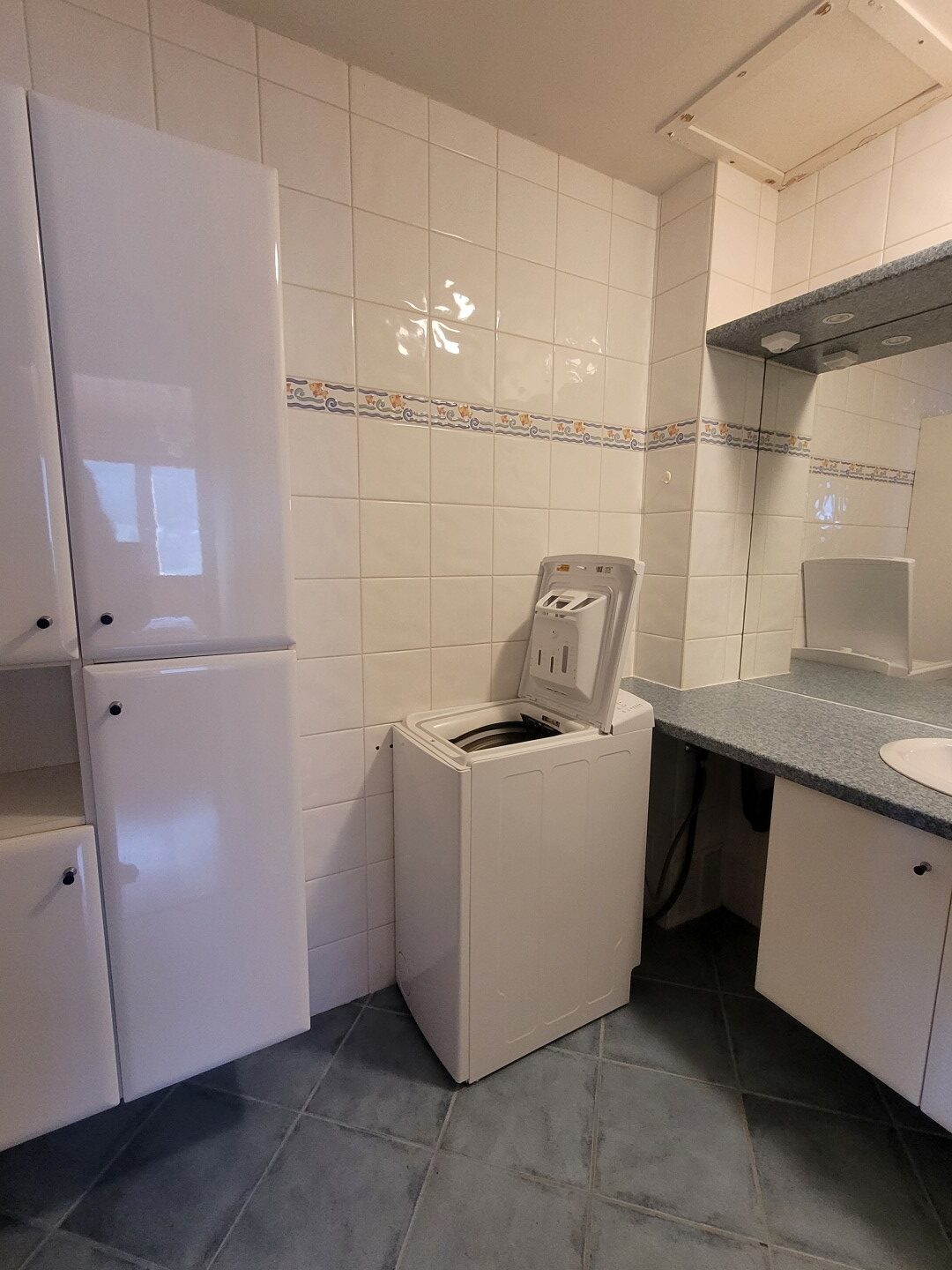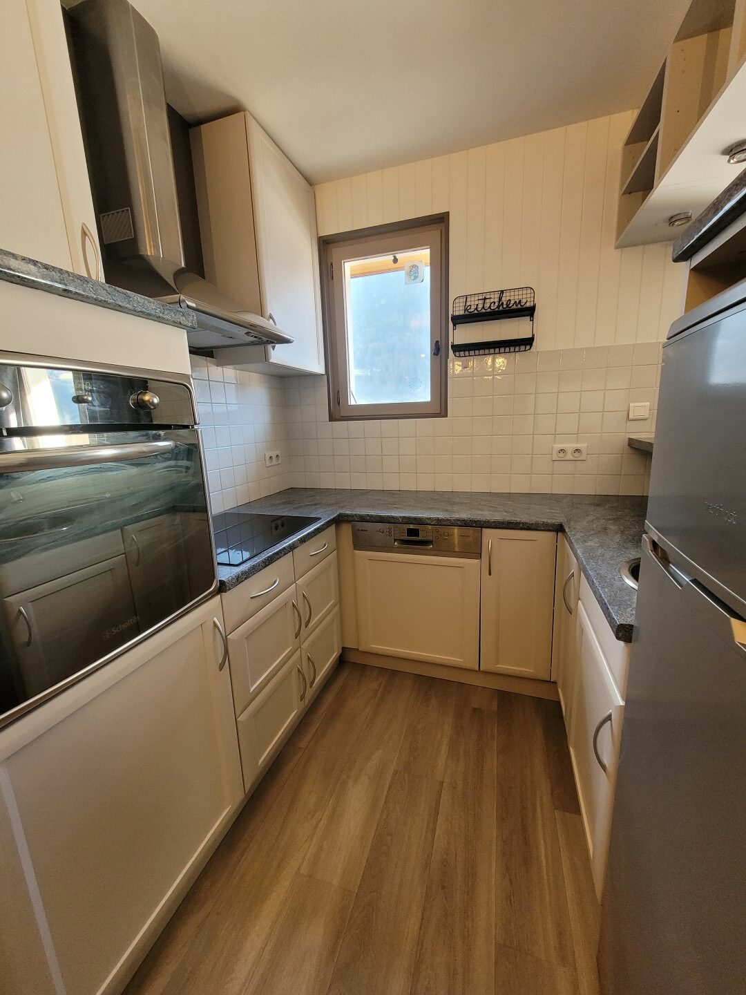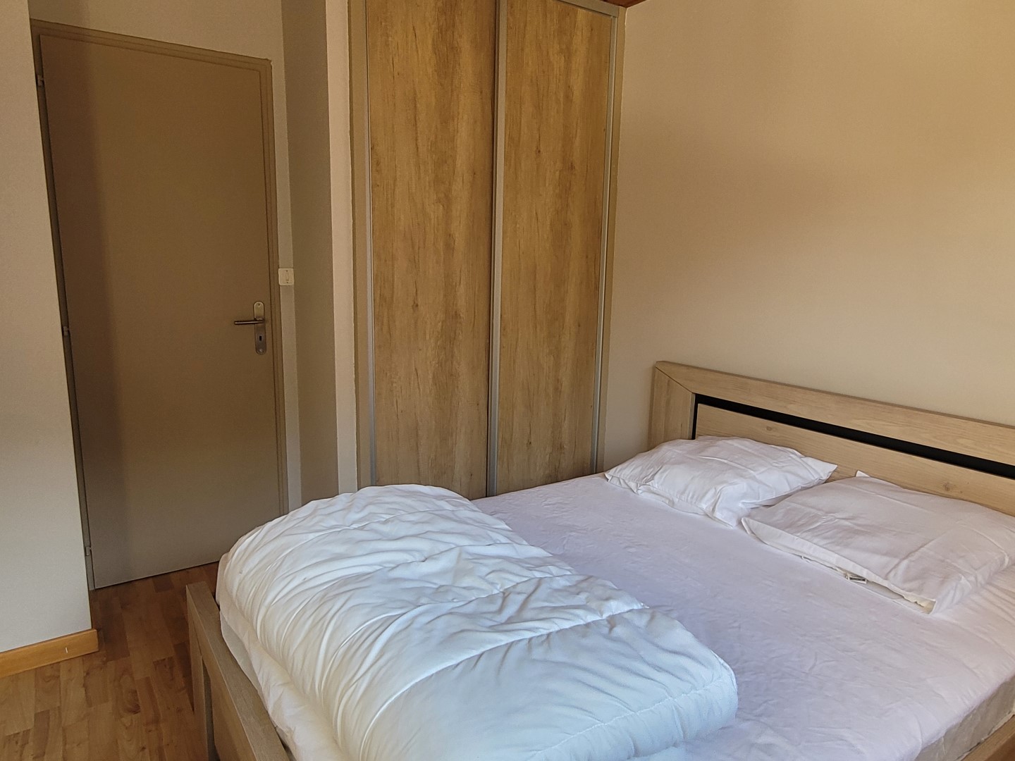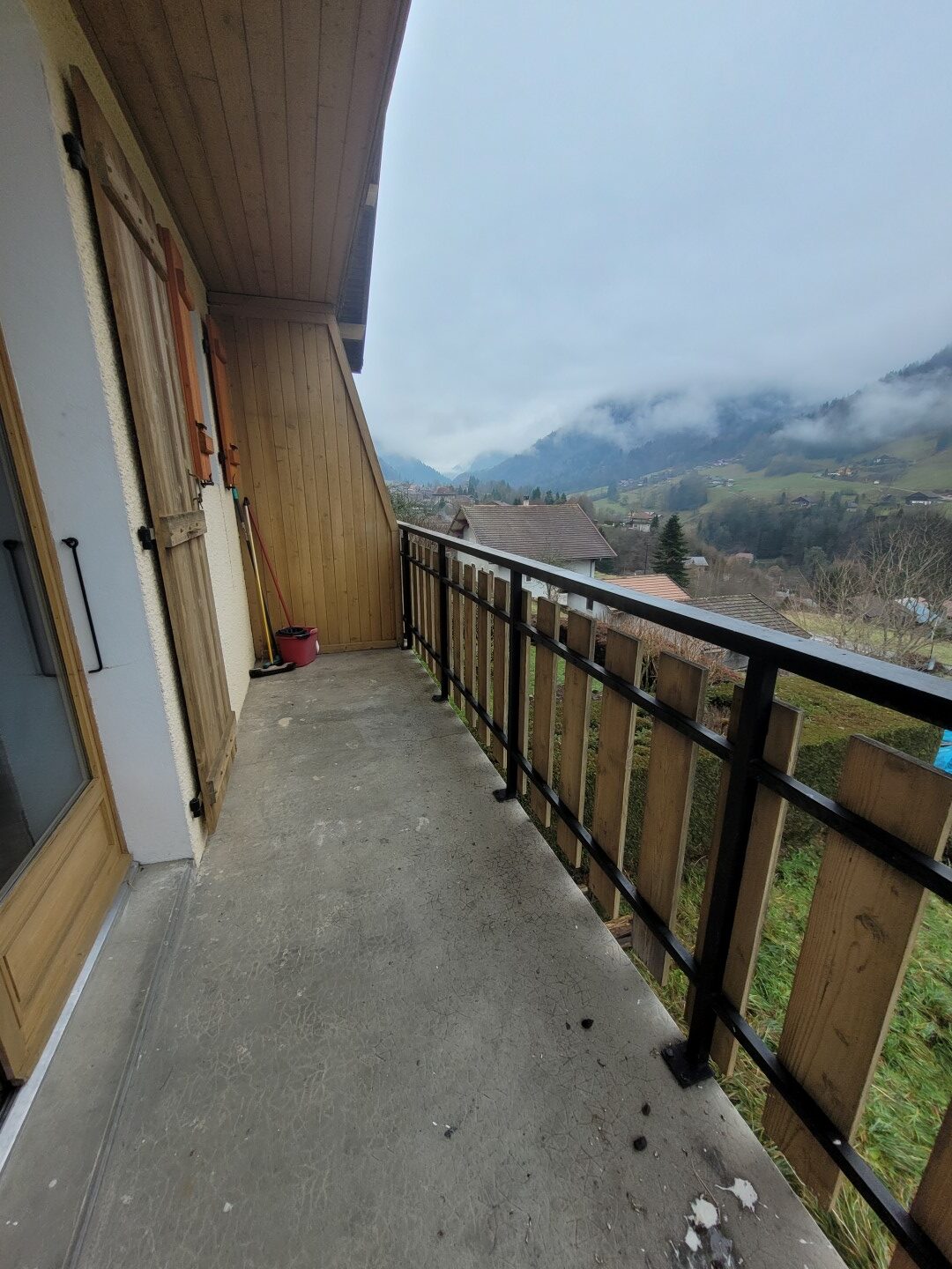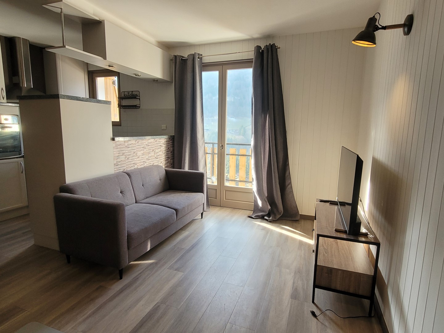Loué meublé et rénové récemment, l'appartement se compose d’un séjour avec poêle à bois et coin cuisine équipé (plaques induction 4 feux, hotte, four, réfrigérateur congélateur et lave-vaisselle) ouvrant sur un balcon et d’un WC au niveau principal.