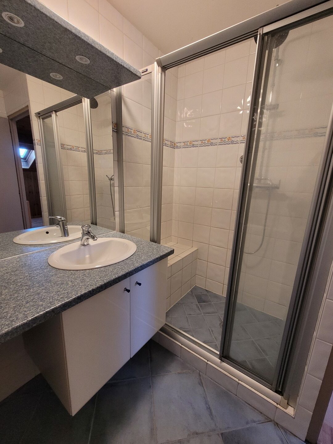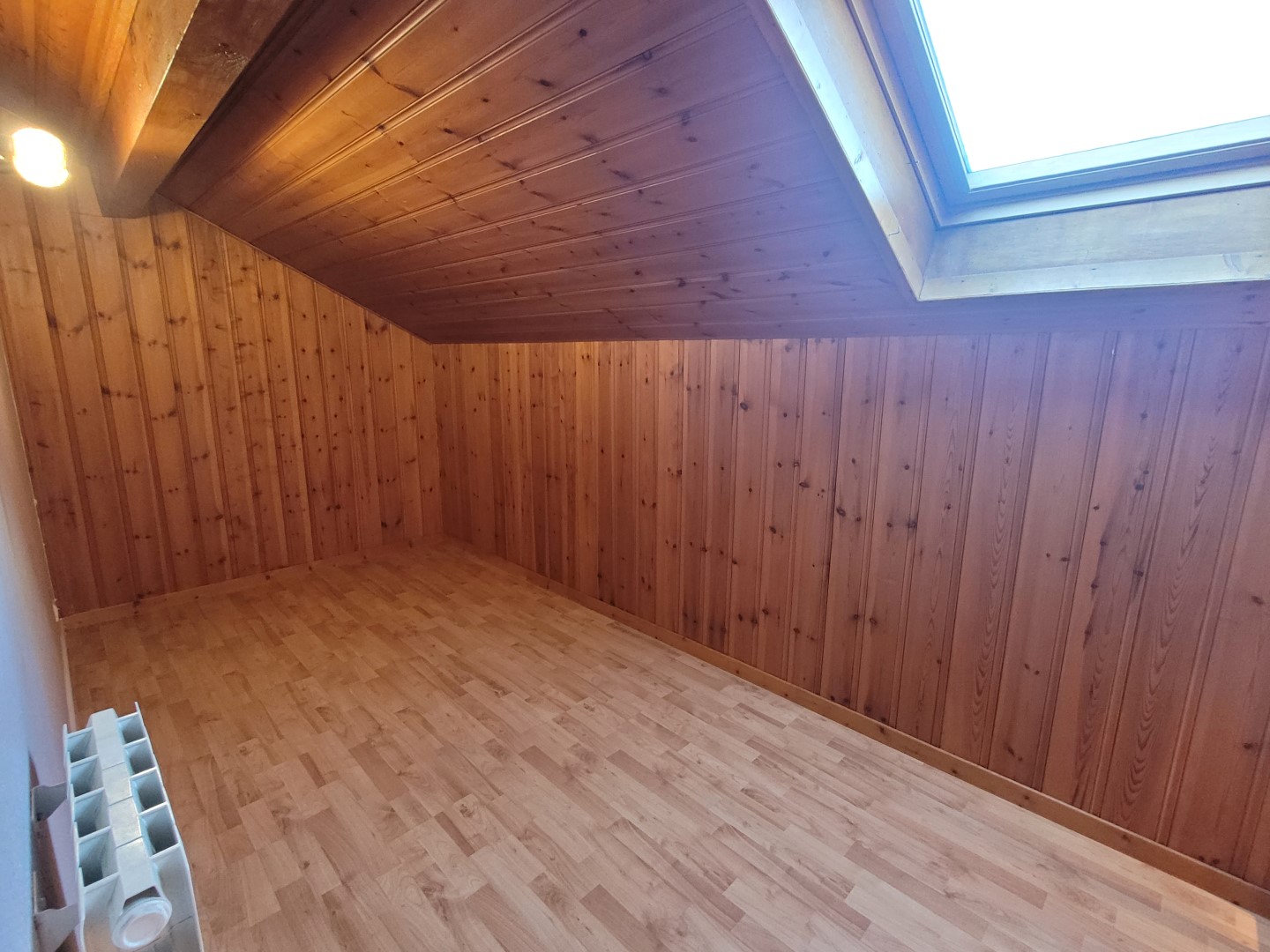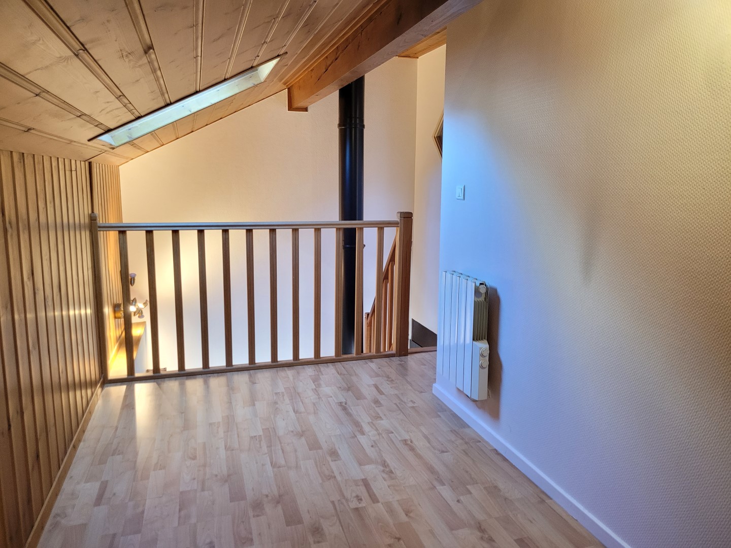 L’étage se compose d’un espace en mezzanine avec placard, d’une chambre avec placard et d’une salle d’eau.
