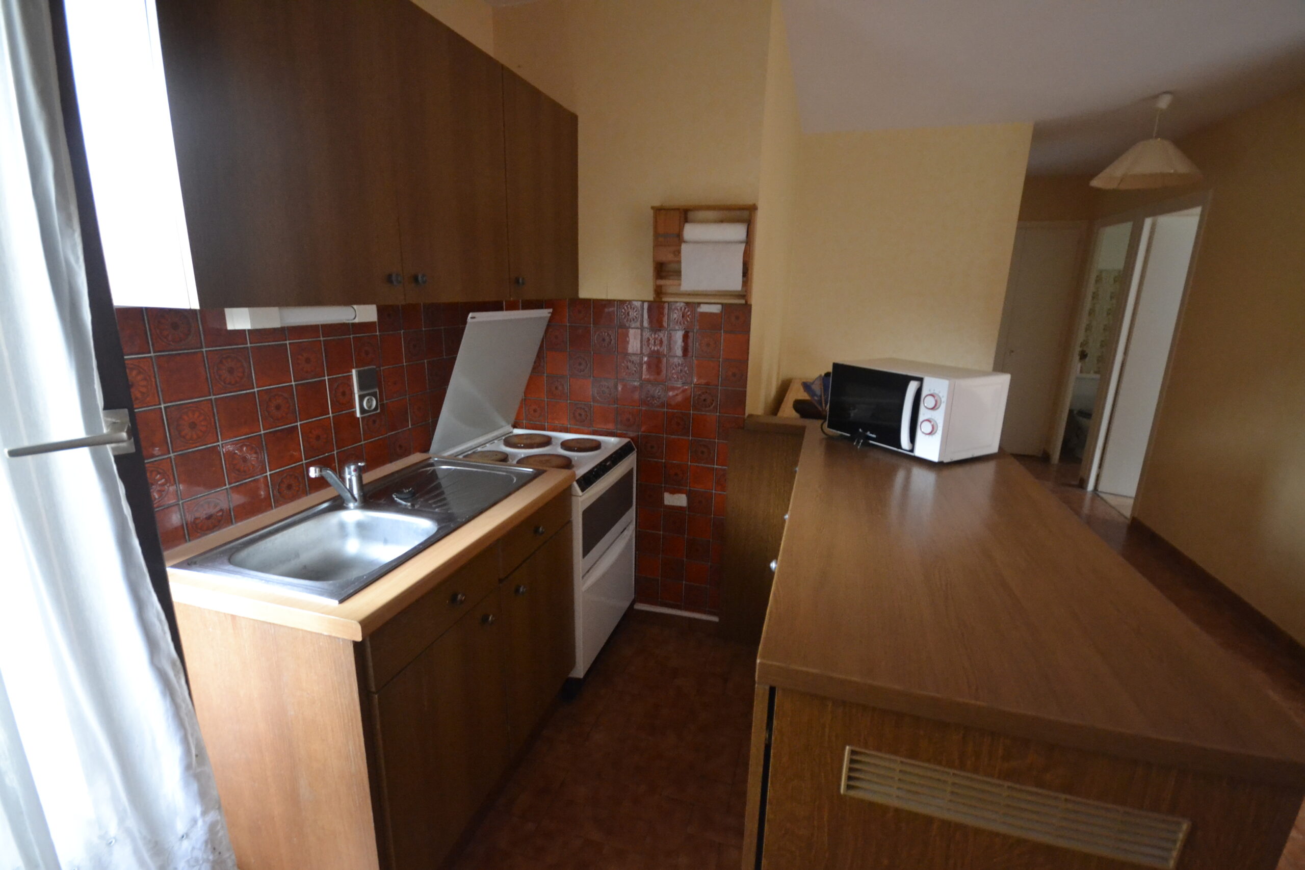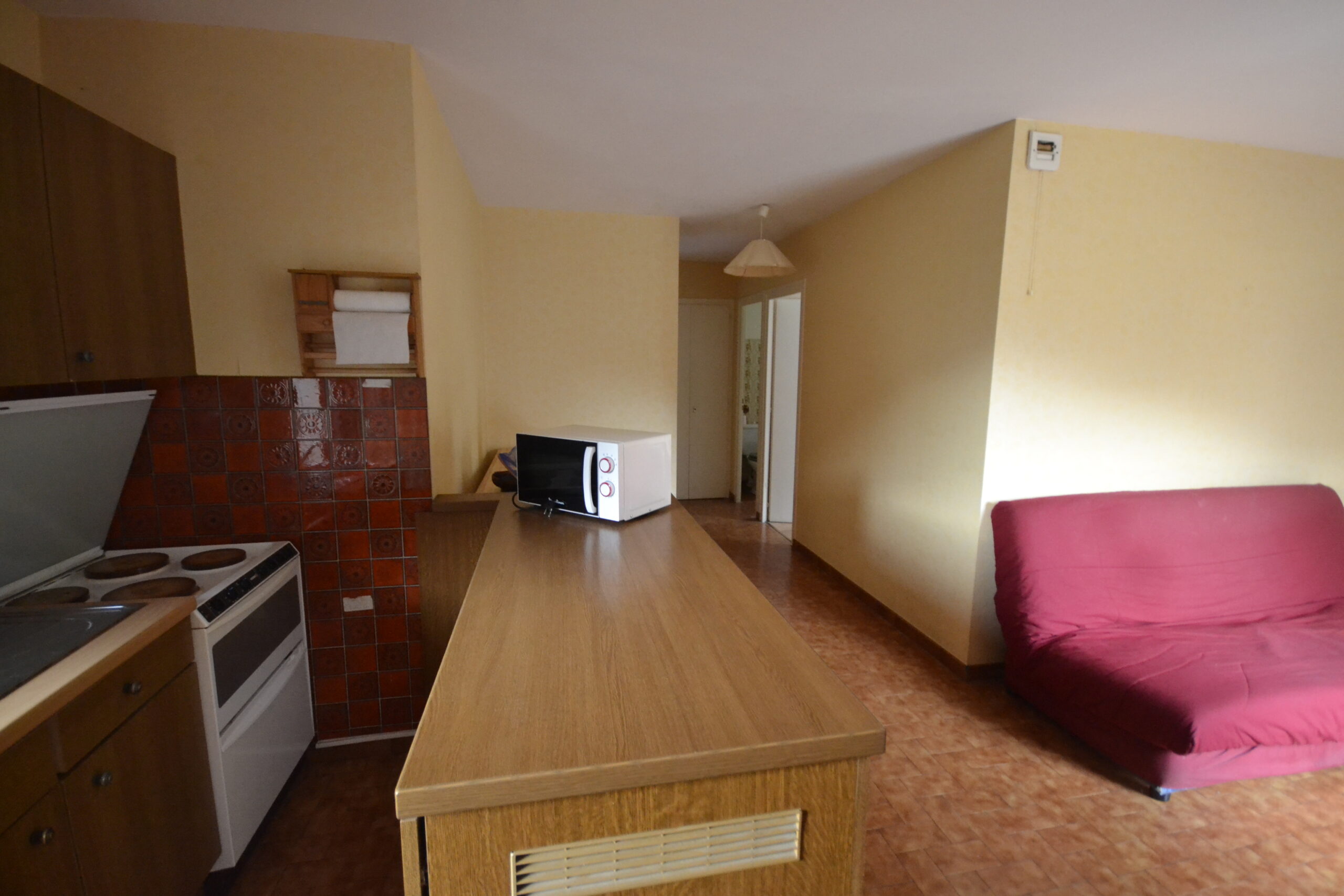 Il se compose d'une entrée avec placard, d'une cuisine équipée (cuisinière, micro-ondes, réfrigérateur) ouverte sur la pièce de vie, une grande terrasse, une chambre avec placard, une salle de bain avec WC et lave-linge.